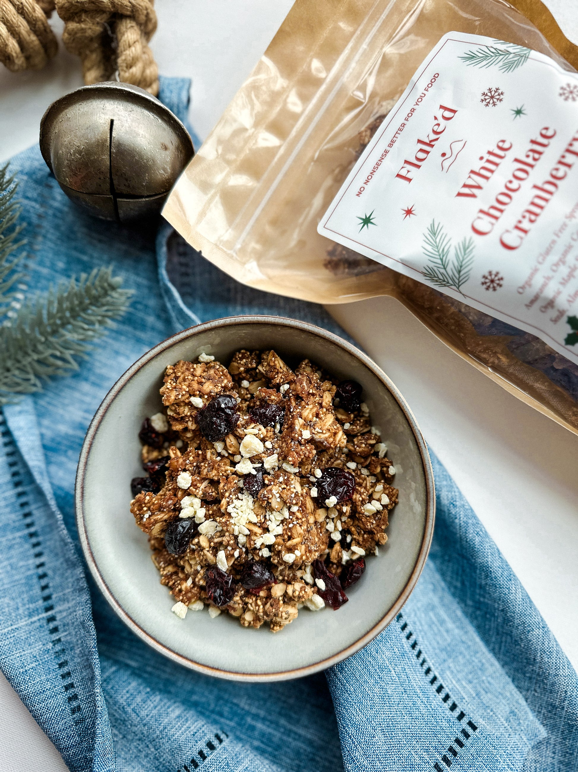 Perfectly light and crunchy with a subtle hint of almond, this seasonal blend elevates our classic vanilla granola with creamy white chocolate powder and juicy dried cranberries. Crafted with organic ingredients, it strikes the ideal balance of sweet, tart, and toasty in every bite — a cozy, winter-ready twist on our beloved original.